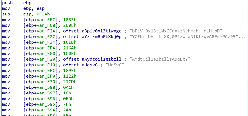 First, the entry point is a function that places data on the stack, an integer at a time, with hundreds of mov instructions. Sometimes, this is a strategy malware uses to reconstruct a code section into the stack then jump to it. But not this time. This is just plain useless.