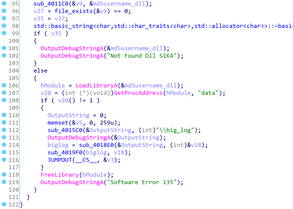 The function tries to load the DLL named after the md5 hash of the lowercased username (see Part 1 for how it’s been put to disk), and call the exported function data. If successful, it loads and decrypts the big_log file, and jumps to it somehow.