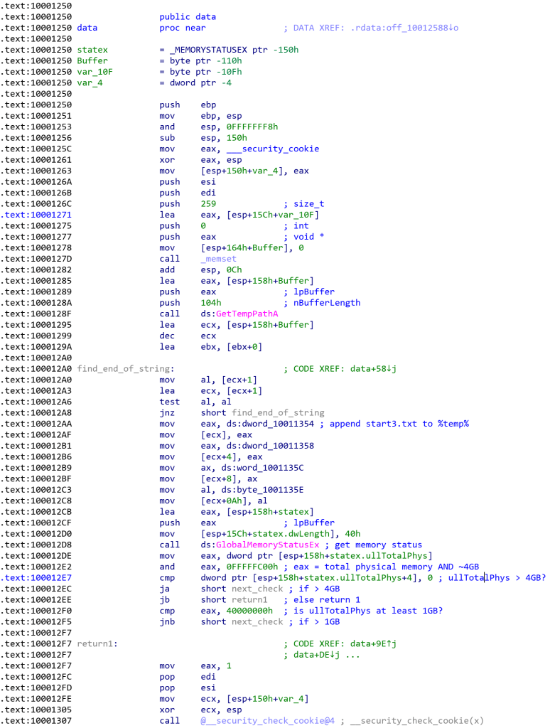 Basically, the function gets the path of the %temp% folder (GetTempPathA), appends “start3.txt” to it, to be used later. Then it gets information about the available memory through GlobalMemoryStatusEx, checks whether there’s more than 4GB of RAM, in which case it continues to the next check. If not or if there’s an insane amount of memory (like, the higher 4 bytes or the DOUBLE DWORD is negative?), the function returns. If there is less than 4GB available, at least there should be 1GB to proceed further.