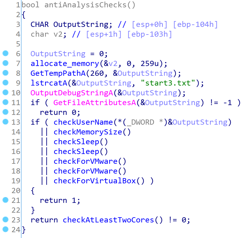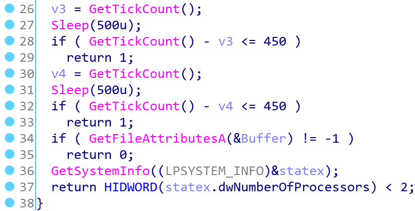 Other checks are reminiscent of our previous analysis in Part 1: the size of the memory is assessed (here, the malware stops if there is less than 2.33GiB of RAM), Sleep functions are verified to be executed and not skipped, the number of CPU cores is verified (at least two cores are needed), and an inexistant file does not suddenly exist.
