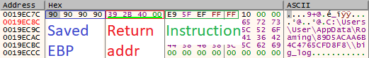 The previous return address (402E69) has changed to 402B39. The saved EBP has been NOP’d and the first and a bit of the second argument have been overwritten.