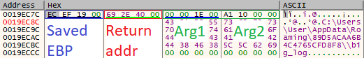 Then, at EBP+8 and EBP+C, there are the arguments to the function copy_to_stack, which were in this case the address of the buffer that contains big_log, and its size.