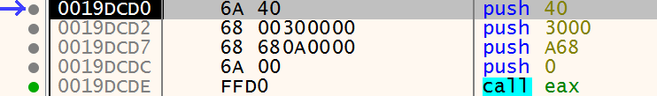 Then, the function is called as VirtualAlloc(NULL, 0xA68, MEM_COMMIT | MEM_RESERVE, PAGE_EXECUTE_READWRITE).