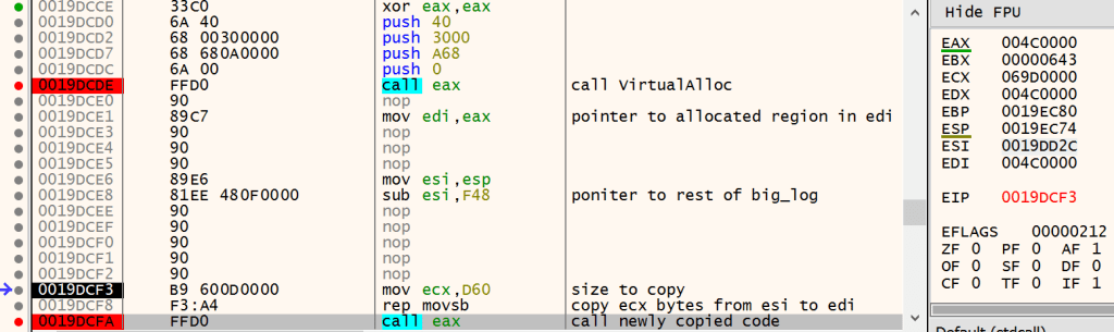 Moving forward, the rest of big_log is copied to the newly allocated memory then executed. This is done by pointing to the location on the stack right after the jmp 19DCD0 at 19DD29, and copying 3,424 bytes until before the padding of NOPs we noticed before. The absolute offset in the decrypted big_log file is 324.