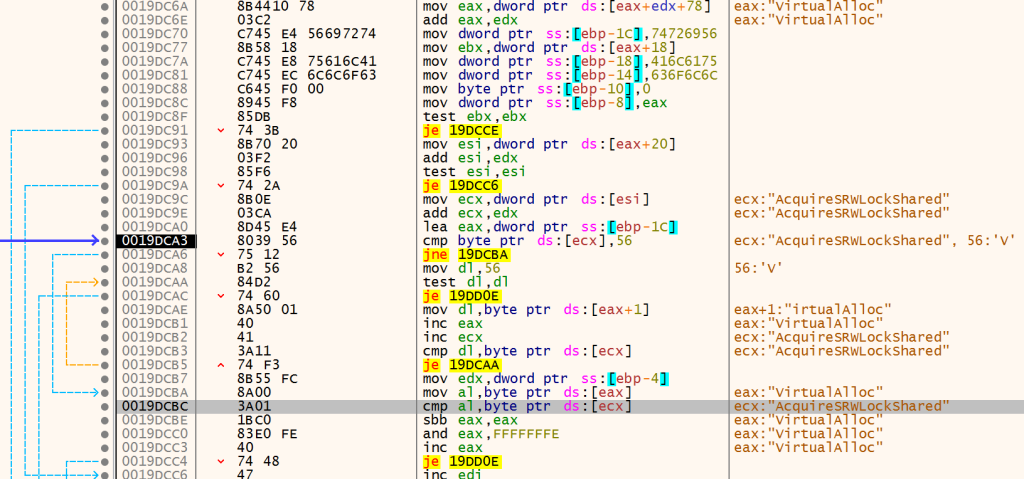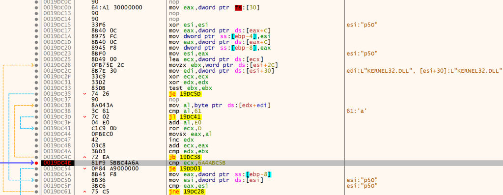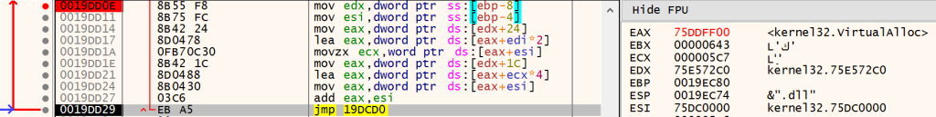 Whenever “KERNEL32.DLL” gets hashed, the digest is 6a4abc5b, which matches the comparison. Then, each exported functions of this DLL is iterated over to find a match with “VirtualAlloc”.
