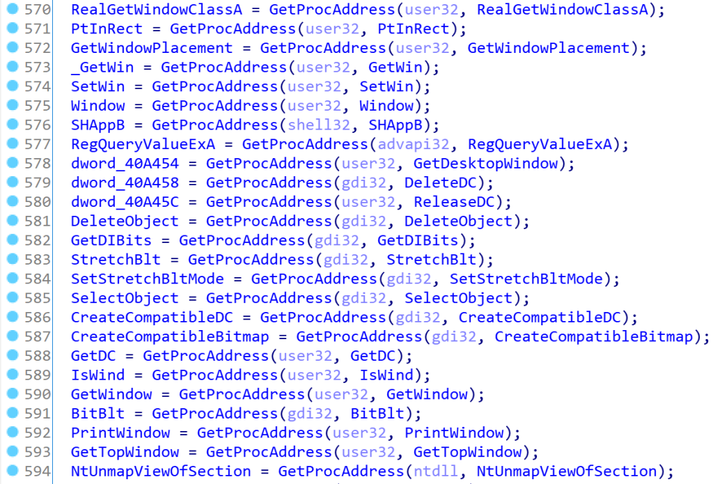 Afterwards, strings that correspond to a library function name are loaded through GetProcAddress. To rename the corresponding variables that designate the function pointer, I also made a lazy script adapted from the pattern I’ve seen in the code: I noticed that there is a push for the string, then five instructions later, the function pointer is moved to a variable. So my script simply identifies the string being pushed and renames the variable 5 instructions later…