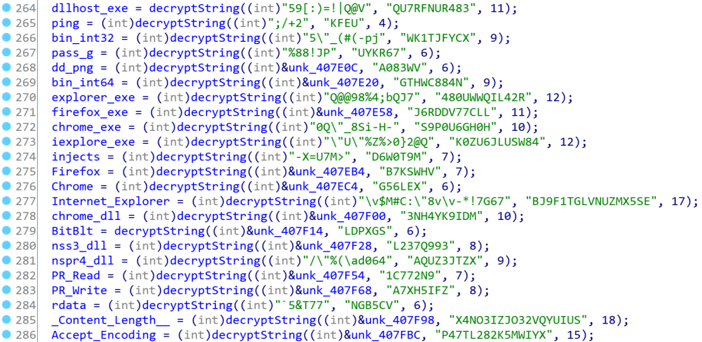 The other string decryptions with “unk_” variables simply correspond to non-printable strings. For instance, unk_4060A0 is “\x17\x30\x5D\x21”. Once XORed with “9S2L”, it gives “.com”.
