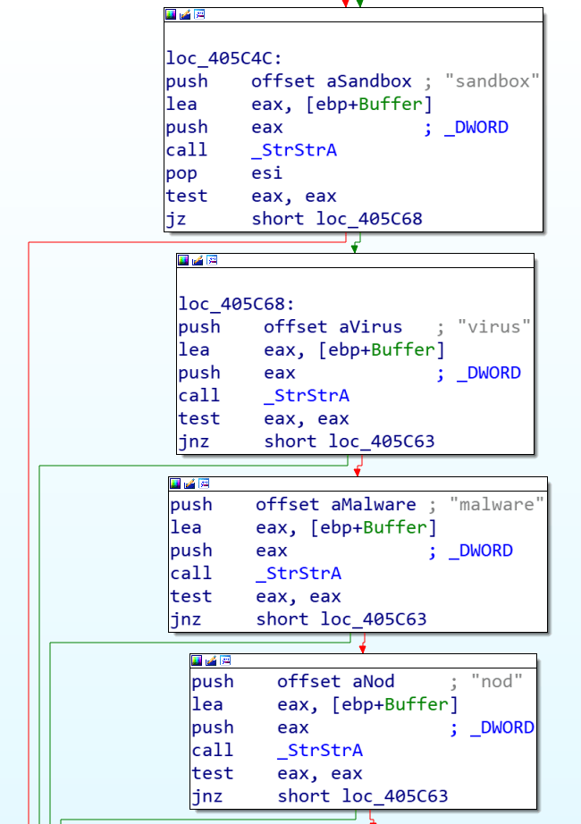First, the Windows username is checked against known keywords such as “sandbox”, “virus”, “malware”, “nod”, “kas”, “av”, “kis”, “STRAZNJICA.GRUBUTT”, “esset”.