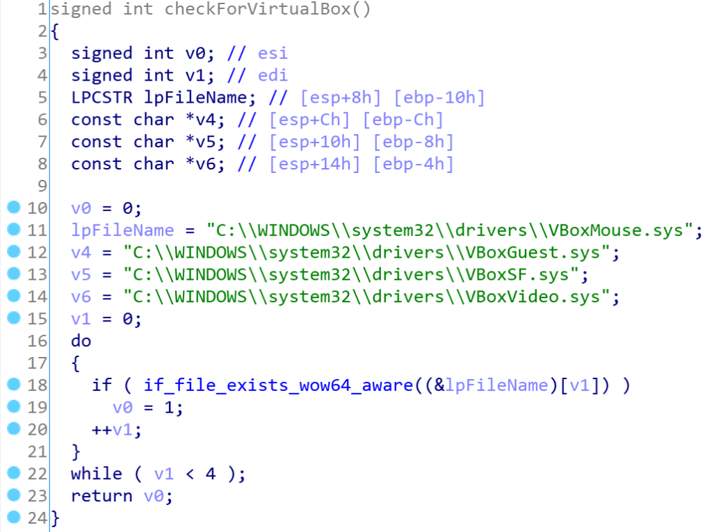 In addition, two new checks look for artifacts of VMware and Virtualbox by proving the registry for a known key, and for known driver files.