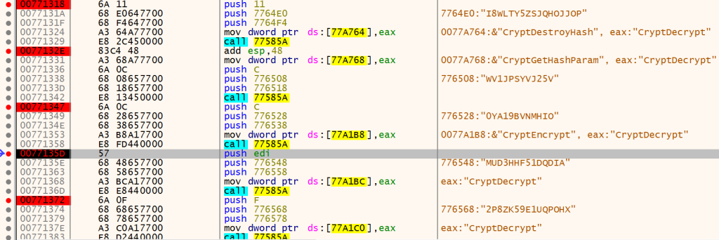 I see some “CryptEncrypt” and “CryptHashData” names, that means we may have fun later on with some crypto! Unless the code just prepares the strings for all exported functions and in the end do not use all of them 😦