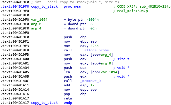 The function, which I called copy_to_stack, allocates 4,244 bytes on the stack, then calls memmove(4257, &biglog, &var_1094), with var_1094 being located just 0x1094 (4,244) bytes above EBP.