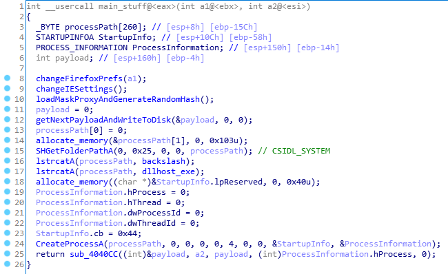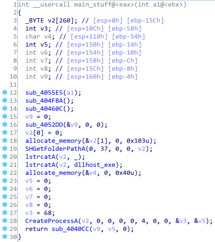 main_stuff shows an overview of data.dll‘s payloadThe process dllhost.exe (from %windir%\System32) is created, and its process handle is passed to the last function sub_4040CC.