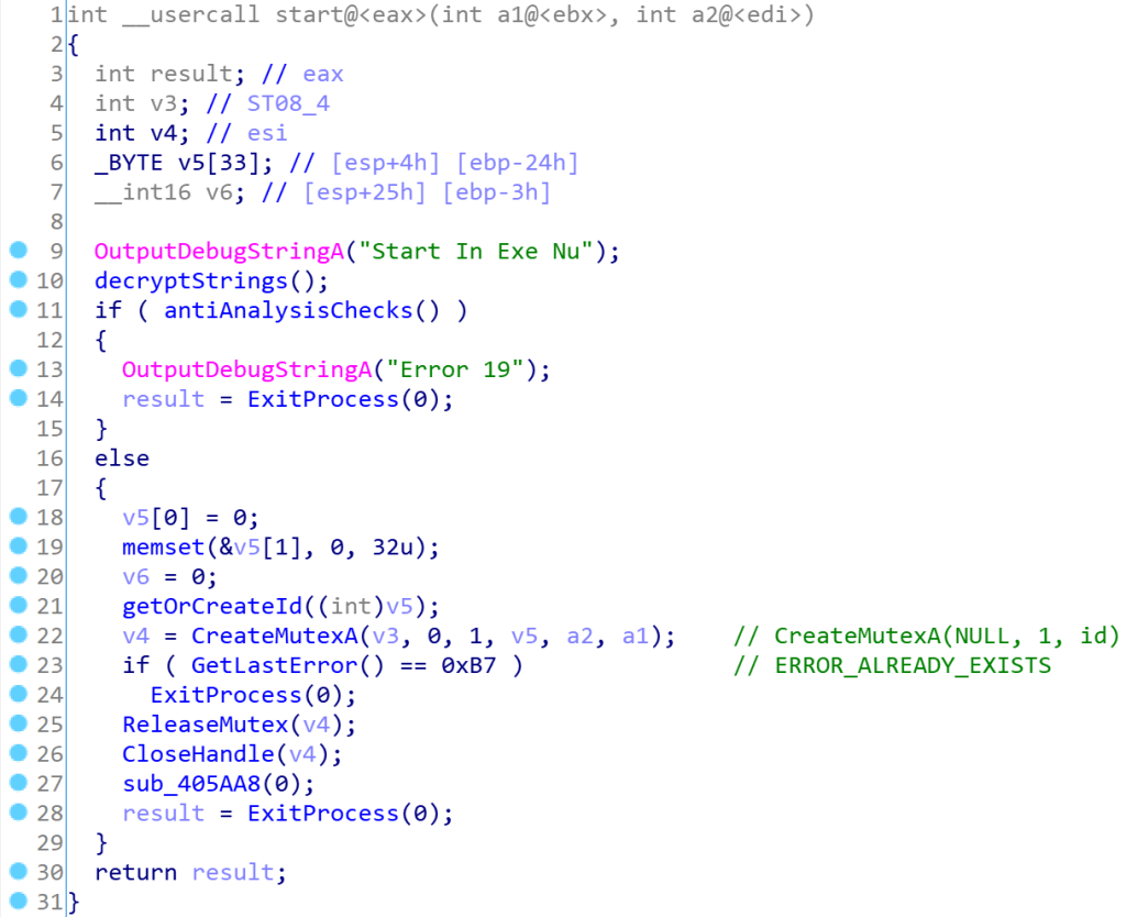Now that we have reconstructed the variable names and library function names, figured out the anti-analysis functions, we can get an overview of the start function.