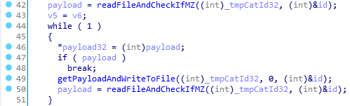 The function getPayloadAndWriteToFile is similar to readFileAndCheckIfMZ but instead of reading a file, it calls sub_404665(&bin32or64, &payloadSize). The first argument is the string bin|int32 in our case, and the second argument will receive the size of the returned buffer.