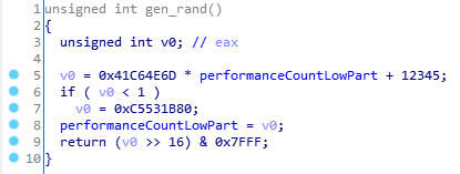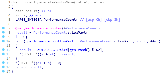 First, it generates a random 9-character string by using a simple rand() function seeded with the Performance Counter, a high-resolution time stamp.