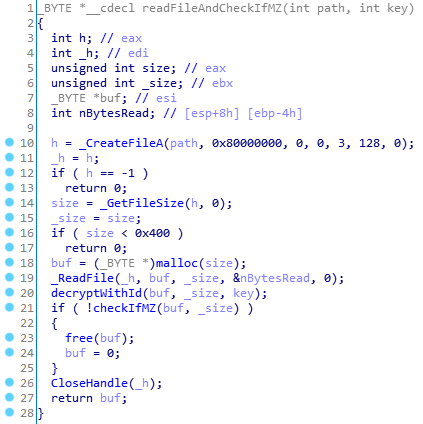 readFileAndCheckIfMZIn turn, checkIfMZ simply checks that the buffer is at least 0x400 bytes and starts with MZ: return size > 0x400 && *buf == 'M' && buf[1] == 'Z';