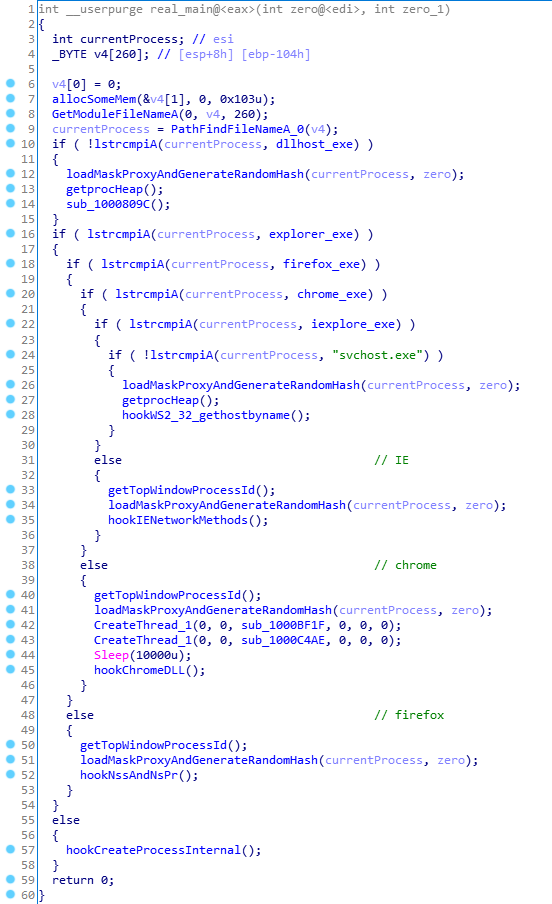 It then assumes it runs into other processes, such as iexplore.exe (IE), chrome.exe, firefox.exe, and explorer.exe. For each of these processes, the payload is adapted.
