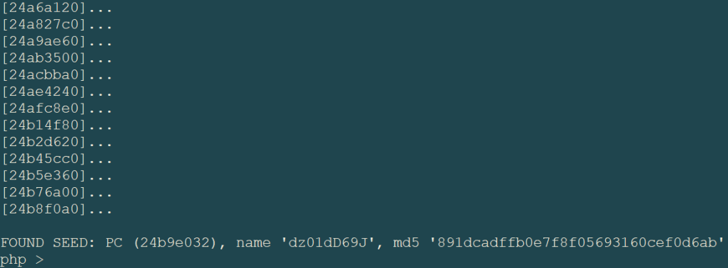 echo "\nFOUND SEED: PC (".dechex($pc_i)."), name '$name', md5 '".md5($name)."'\n";