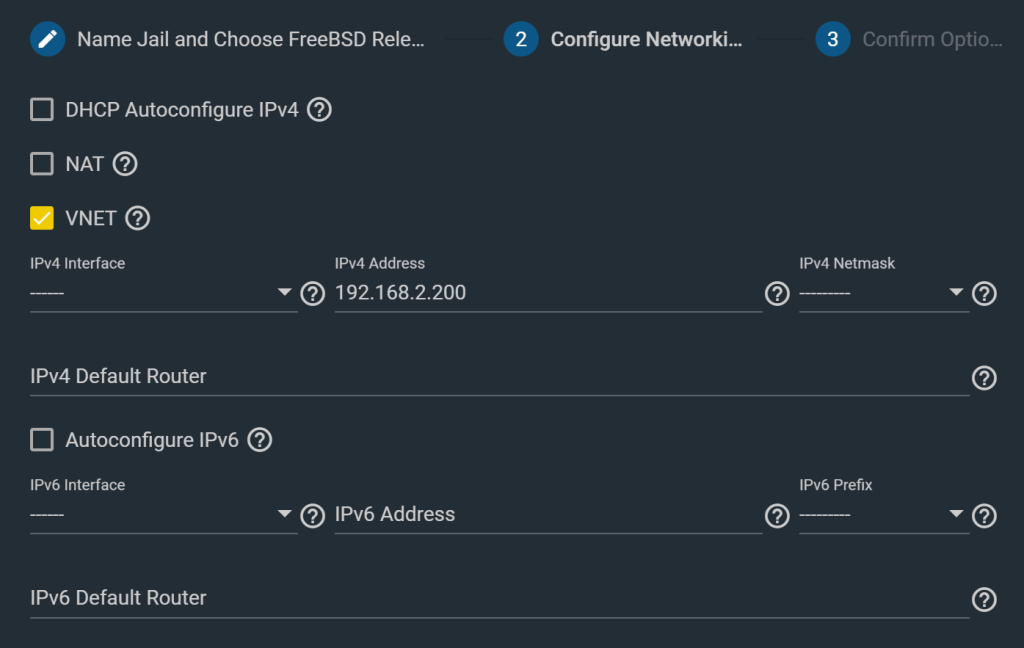 Check VNET and select either DHCP (if your router can be configured to give static DHCP lease for instance), or give it a static IP. Next. Submit.