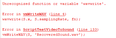 In vmWriteWAV.m, replace wavwrite(S.x, S.samplingRate, fn); by audiowrite(fn, S.x, S.samplingRate); (be careful, the argument order changed). You actually don’t need to rerun the whole program, actually simple run audiowrite("recoveredSound.wav", S.x, S.samplingRate); since S is already in your environment now. Here is the recovered sound: