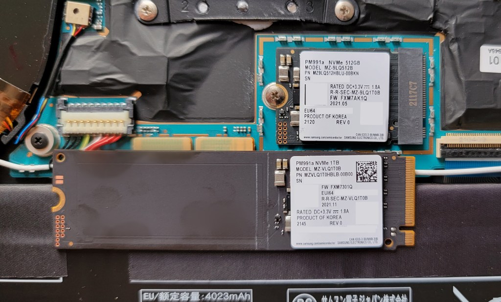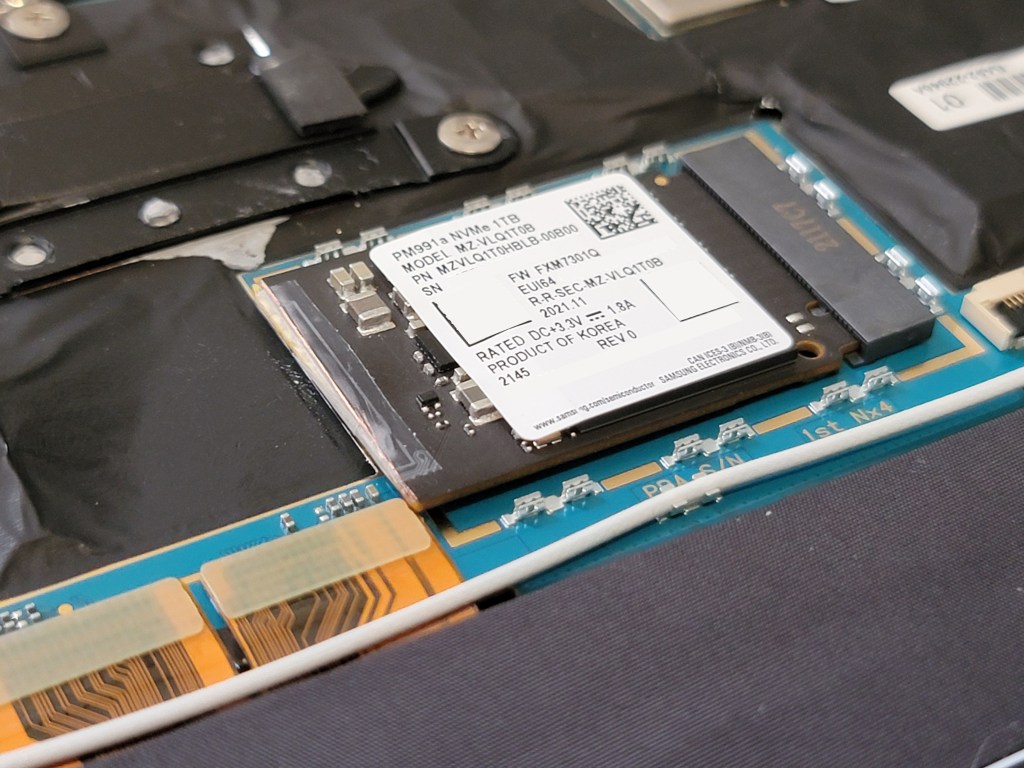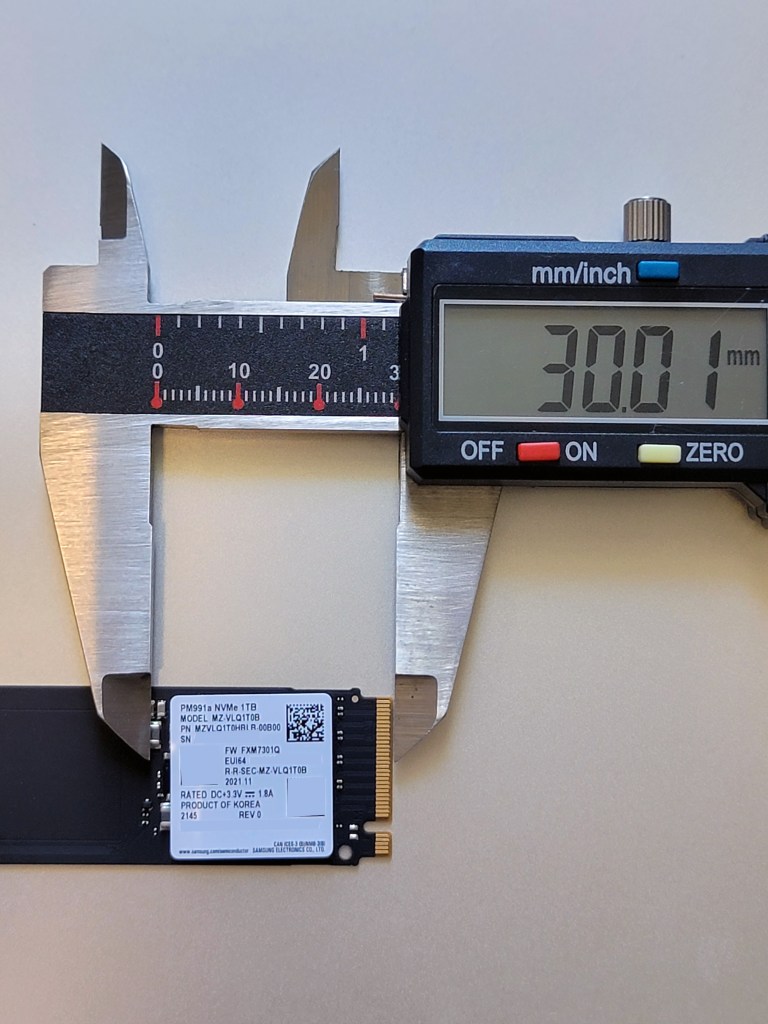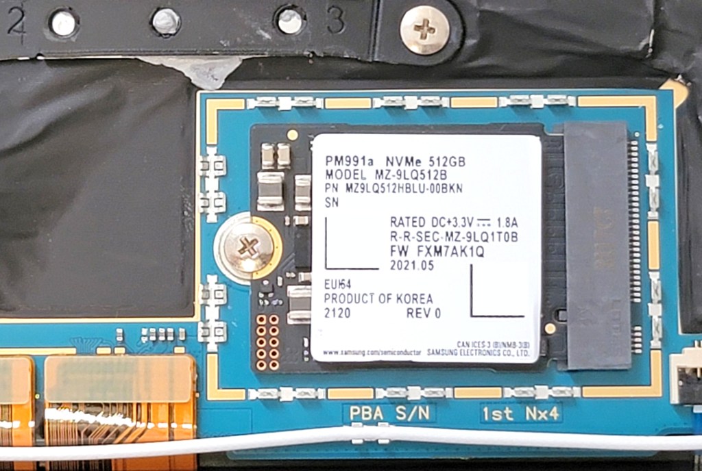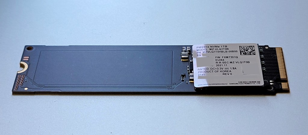 After more searches, I figured a Samsung PM991A MZVLQ1T0HBLB would be a good option (spoiler: it was not!). The blog post said the performance were better than the Kioxia. The model exists on Samsung’s website (although no mention about the format). So I bought it from a German website for the equivalent of $137+shipping.