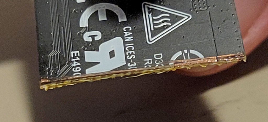 After I polished the edge with a nail file to make sure there were no copper threads in the air, I put a small piece of tape to avoid making contact with any part of the motherboard.