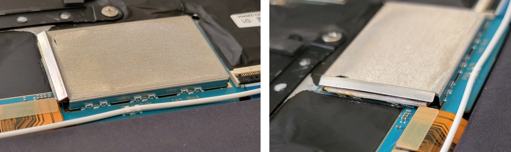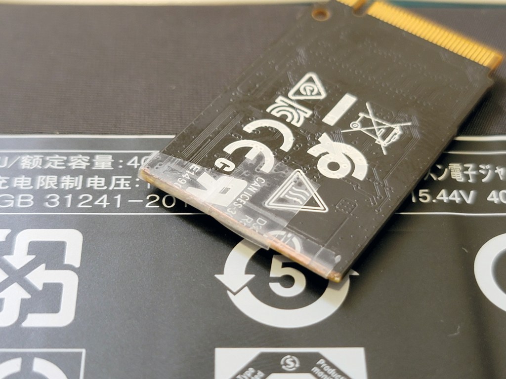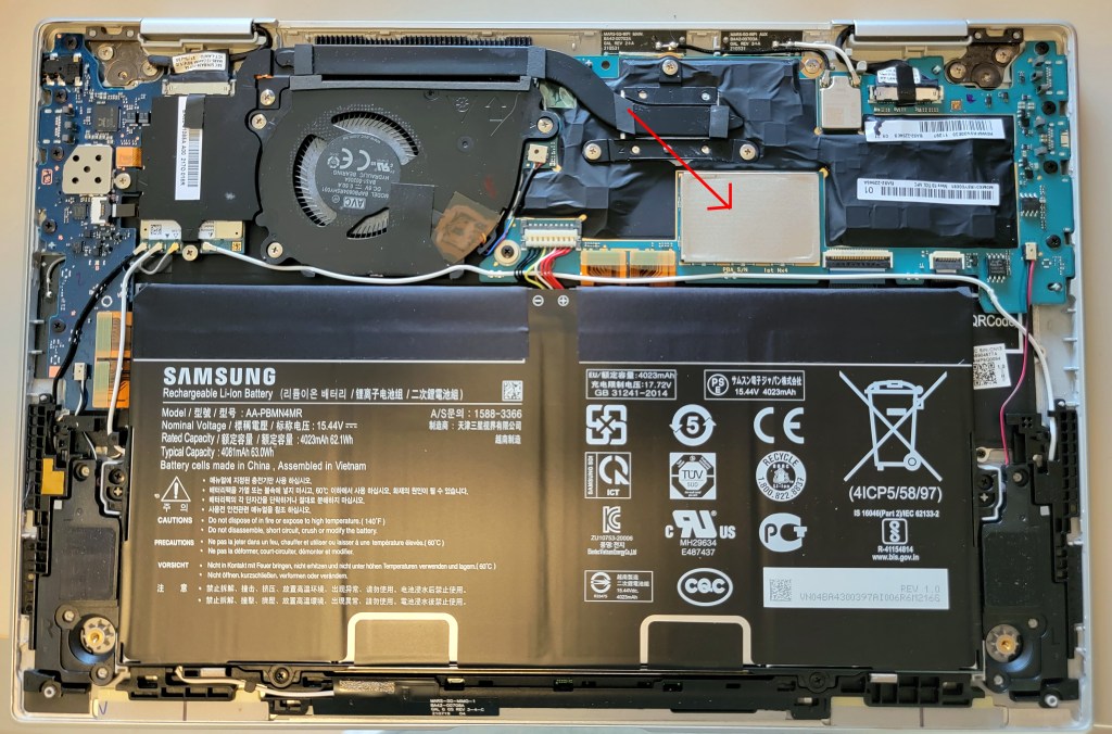 Not knowing this laptop’s SSD is not the standard 2280 format, I ordered a Samsung 980 Pro 1TB. Then, I opened the laptop and searched for the SSD slot… and I couldn’t find it. I feared it could be soldered on the motherboard, but finally, I lifted one metal cache and found it: it’s a 2230 SSD, meaning its size is 22x30mm.