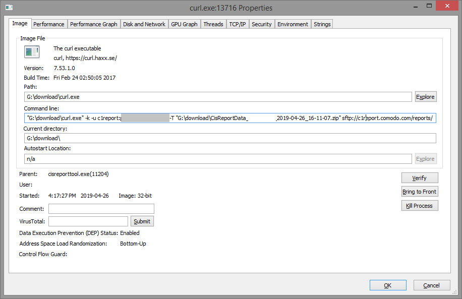 The tool passed some credentials as an argument to curl: c1report:**** (password hidden here). Later, I figured those are hardcoded. Facepalm.