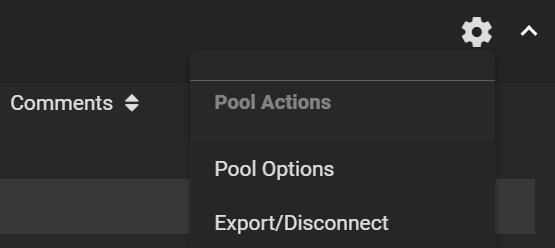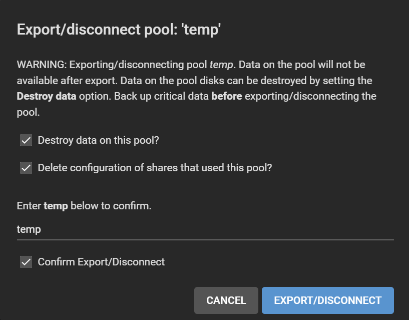 - On the temp pool, gear icon > Export/Disconnect. Tick everything. Click Export/Disconnect.