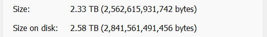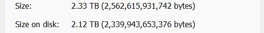 Strangely, on the real system, on a dataset with some 10k files, 1k folders, the effective disk size shrunk notably. The dataset has 2.33TiB worth of data, and it took 2.58TiB of storage before (at a compression ratio of 1.04), and on the temporary pool this dataset now takes only 2.12TiB (interestingly, the compression ratio didn’t change). This is reflected on the “Size on disk” field reported by Windows, and also matches the Used field under the Pool page on TrueNAS.