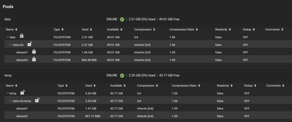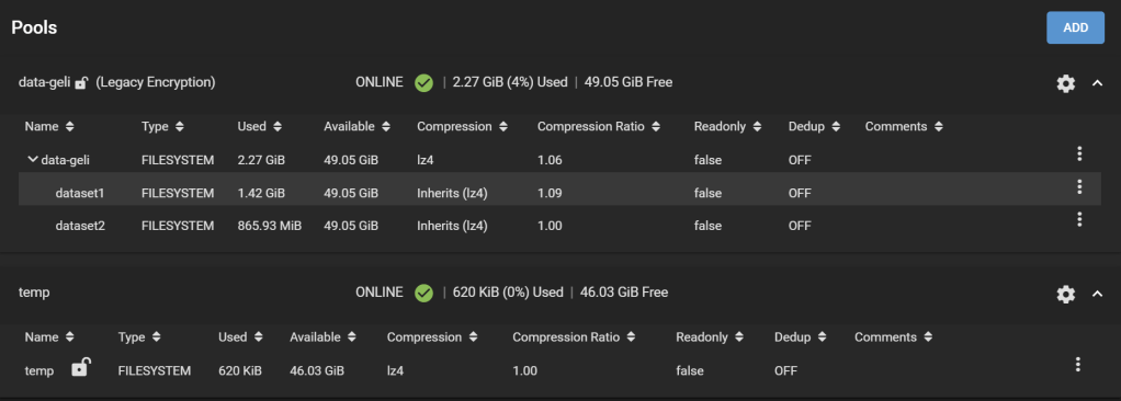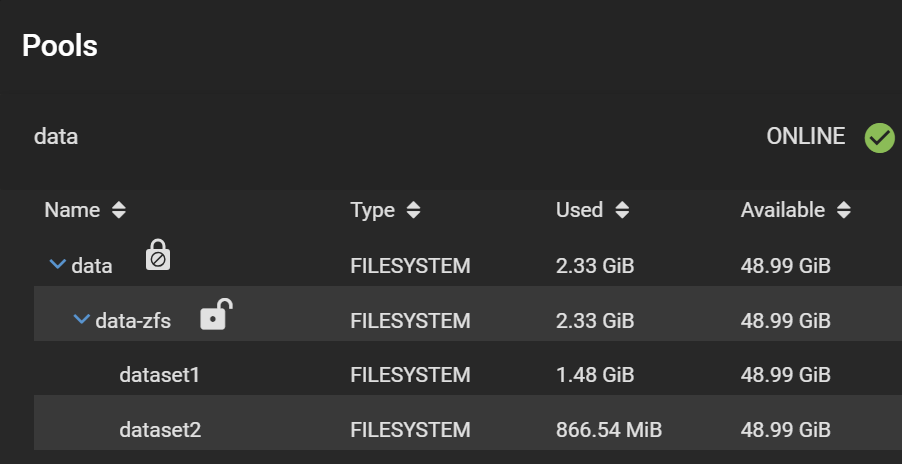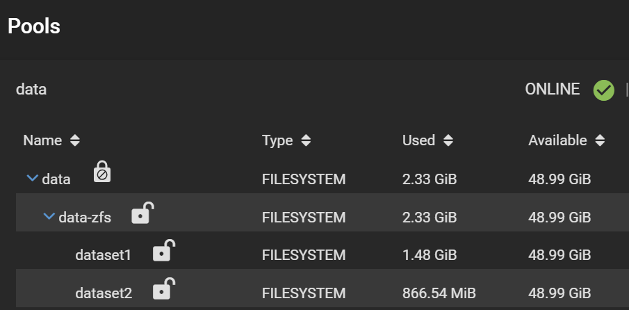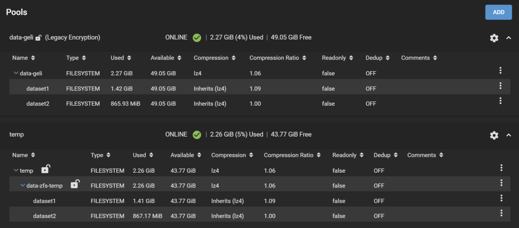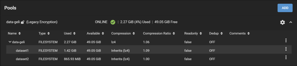 Our pool is called data-geli, is backed by 5x 20GB virtual disks in RaidZ2, and has two datasets, provisioned with 1.42GiB and 865.93MiB worth of data to make it look more realistic.