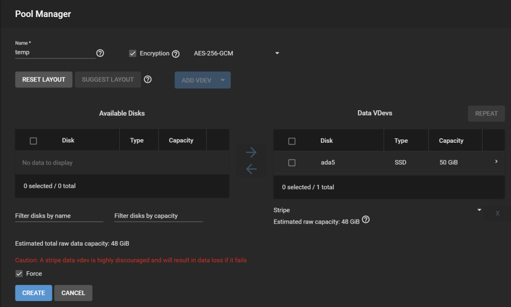 Tick “Encryption“, accept the warning. I only added one disk here, so the new pool is a stripe, which leads to another warning about how unsafe this is (i.e., if this temporary disk fails during the migration process, we are doomed).