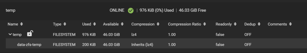 Let’s call our new dataset data-zfs-temp. Leave all options as default as it will be overwritten soon.