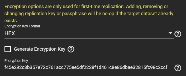 - Select HEX or Passphrase, but this won’t change the fact that TrueNAS will storage the generated key/passphrase to