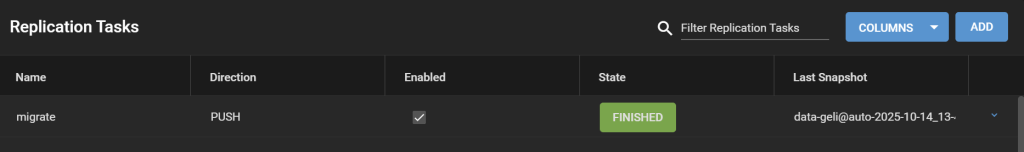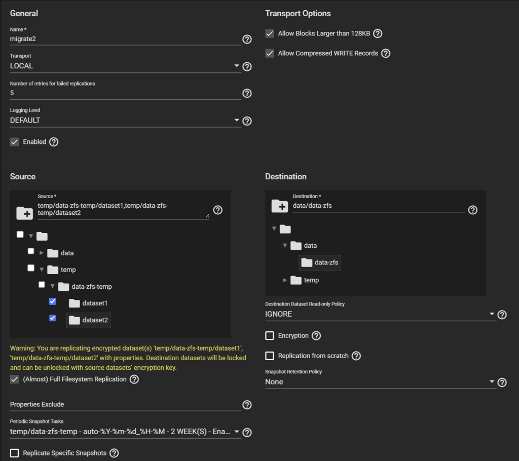/data/freenas-v1.dbon the boot pool. This means, while this replication task exists (running or not), the key to decrypt it is exposed. This is a vulnerable period before you can delete the task and the corresponding data. If you are OK with this, then go ahead, otherwise consider Method #2 instead.