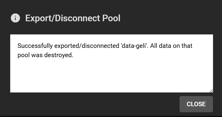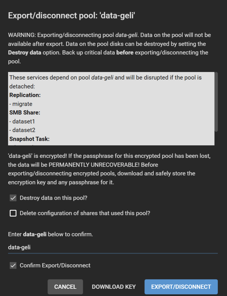 Check all boxes, or maybe keep “Delete configuration of shares that used this pool?” unchecked if you want to restore these shares after re-migration, though you will need to adjust the path for each of them. Follow the instructions and click Export/Disconnect.