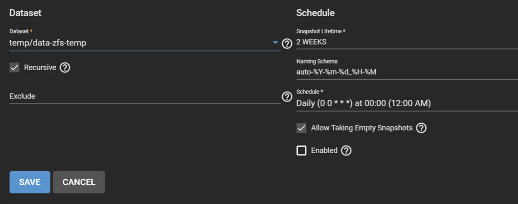 Under Tasks > Periodic Snapshot Tasks, edit the periodic replication task we created earlier and change the dataset to the temporary dataset created earlier that contains all replicated datasets, in our case temp/data-zfs-temp. Enable the task.