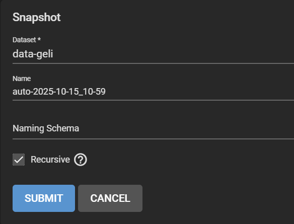 Go to Storage > Snapshots, click Add. Select the original dataset, in our case ashley-test. Change the “manual” part of the suggested name to “auto” to match the periodic snapshot scheme and pretend that it ran. Make it recursive to snapshot all child datasets.