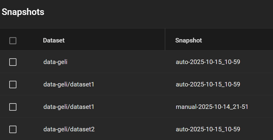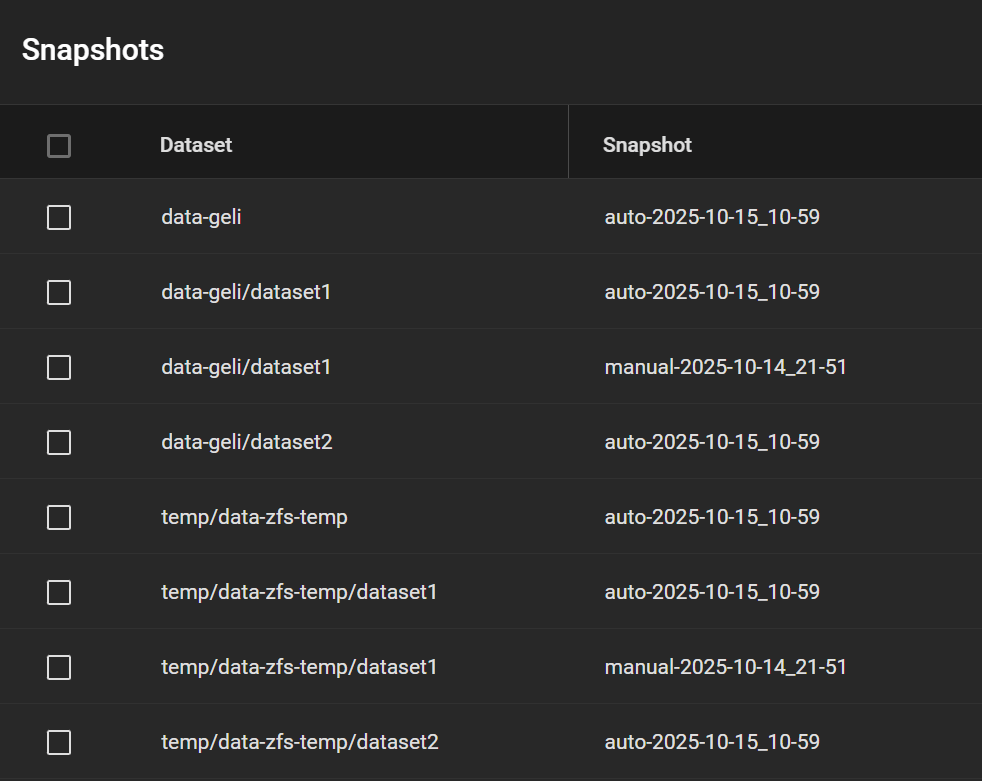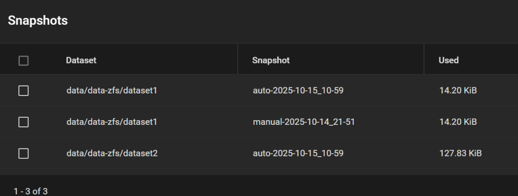 My snapshots then looked this like, including a manual snapshot I made earlier (my real system has many other snapshots, so I want to test whether this one appears in the replicated pool).