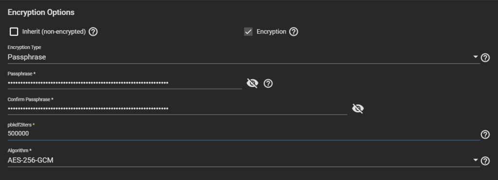 Make it encrypted. Choose Encryption Type: Passphrase. Choose a strong one, possibly your final passphrase. The number of PBKDF2 iterations defaults to 350,000, but other systems like VeraCrypt use 500,000 by default, so feel free to increase TrueNAS’ default value.