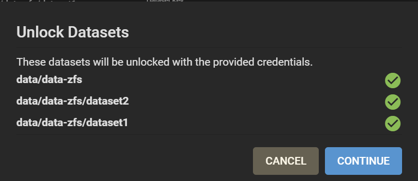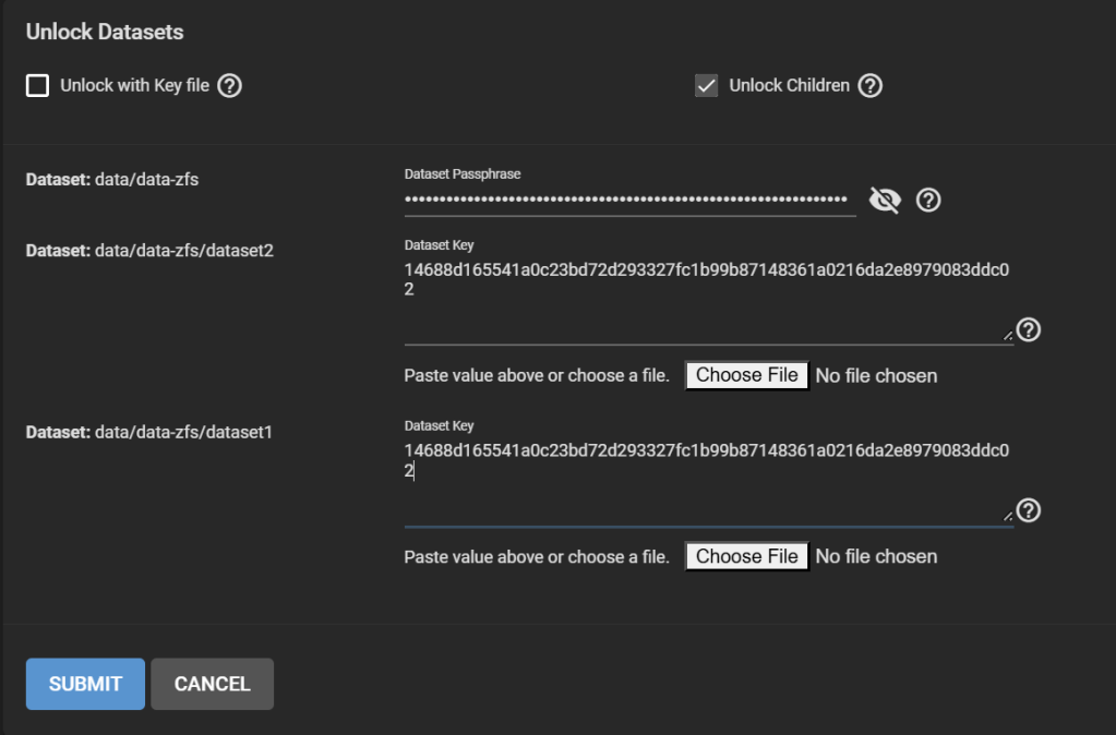 First, lock the data-zfs dataset: three dots > Lock. Then Unlock. This makes it easier to unlock all your datasets. On the Unlock screen, untick “Unlock with Key file”. Enter the passphrase for the data-zfs dataset you created in Step 8. Enter for all your child datasets the key that was generated in Step 5 and that you should have copied either at that moment, or in Step 6. You can still find it under /tmp/migrationkey if you did not reboot.
