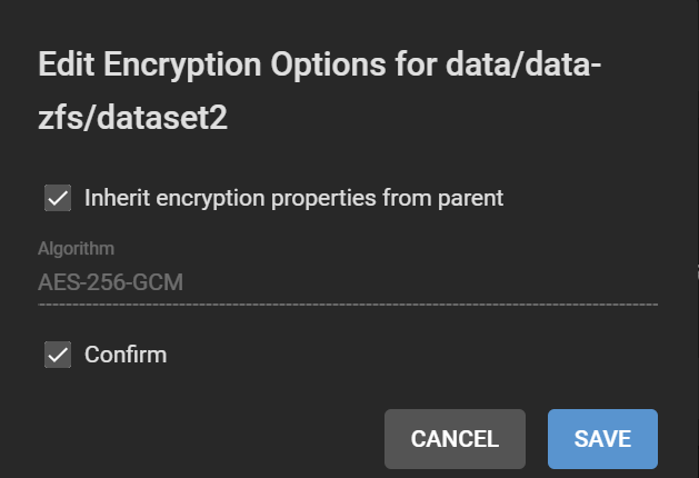 Note the separate padlocks on each dataset, meaning they are governed by different keys/passphrases. Next, we want to make all the child datasets inherit the encryption key (or passphrase in this case) from the data-zfs dataset, so we can unlock them all at once using the passphrase we set. For each child dataset, click on the three dots, Encryption Options. Then tick “Inherit encryption properties from parent“.
